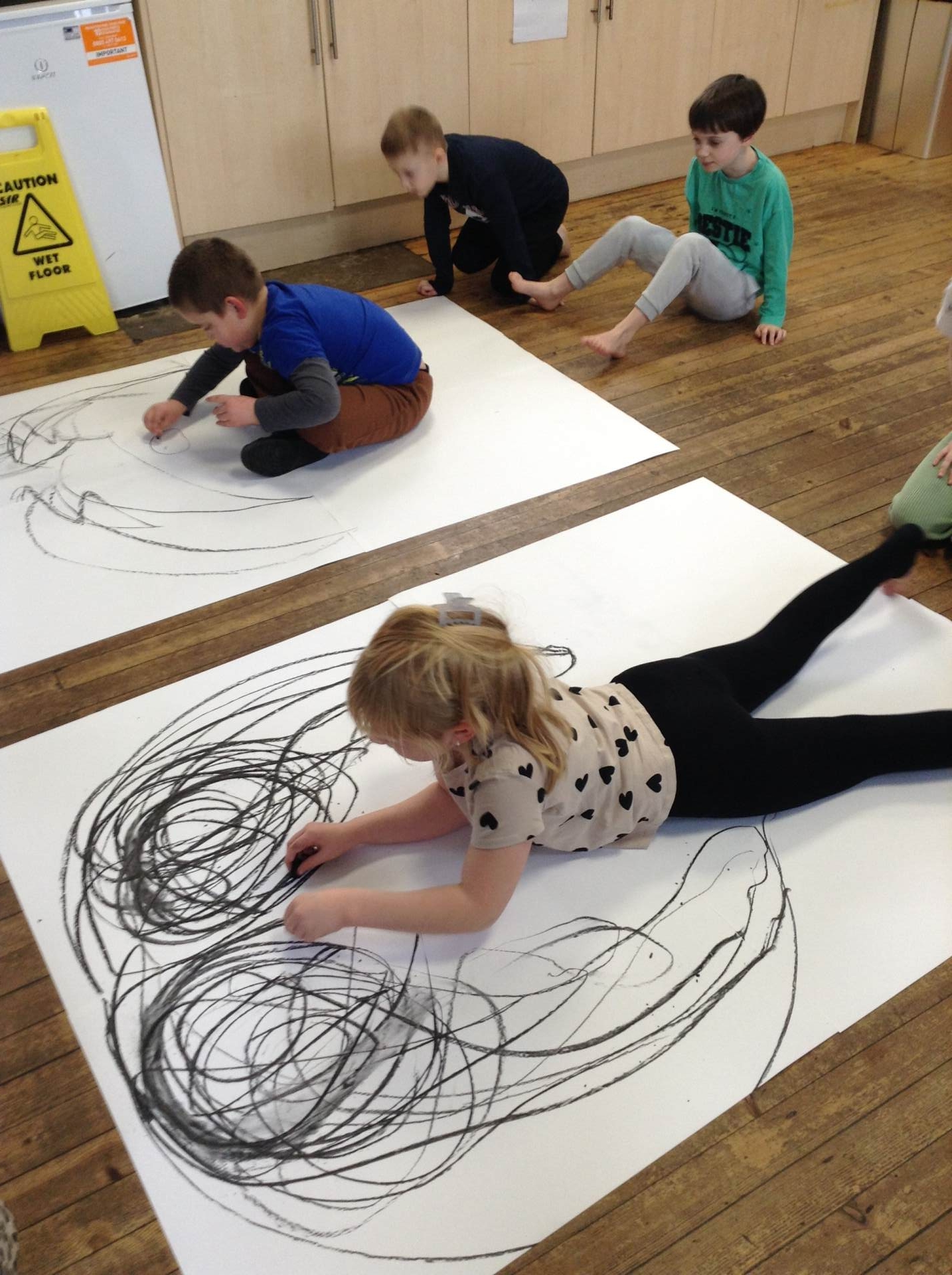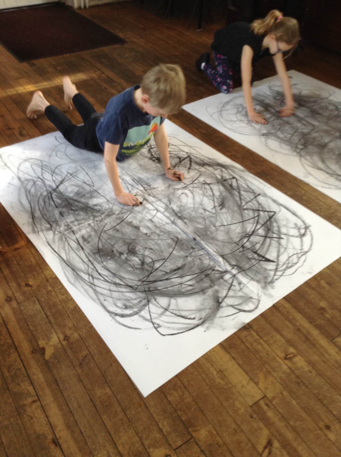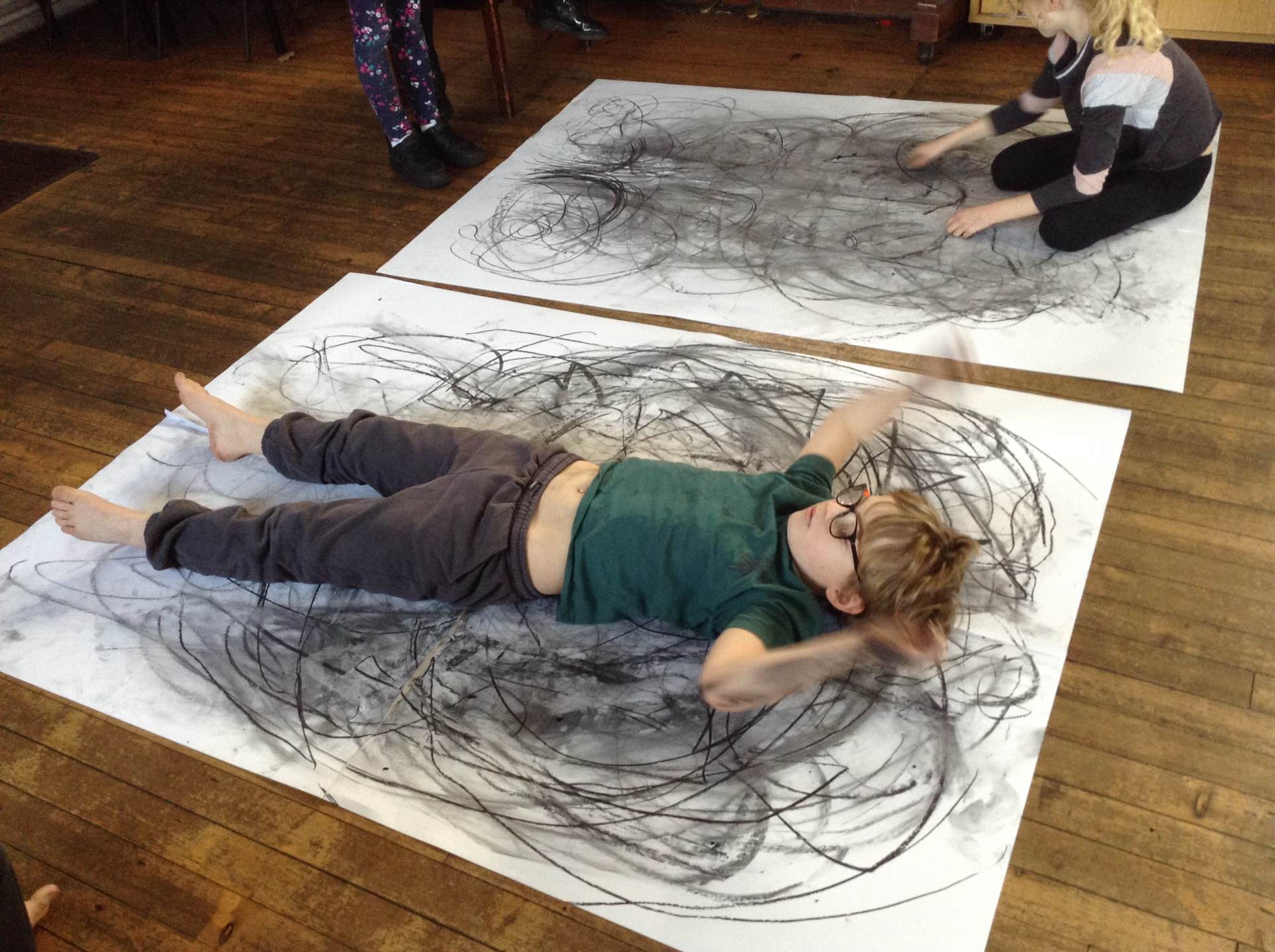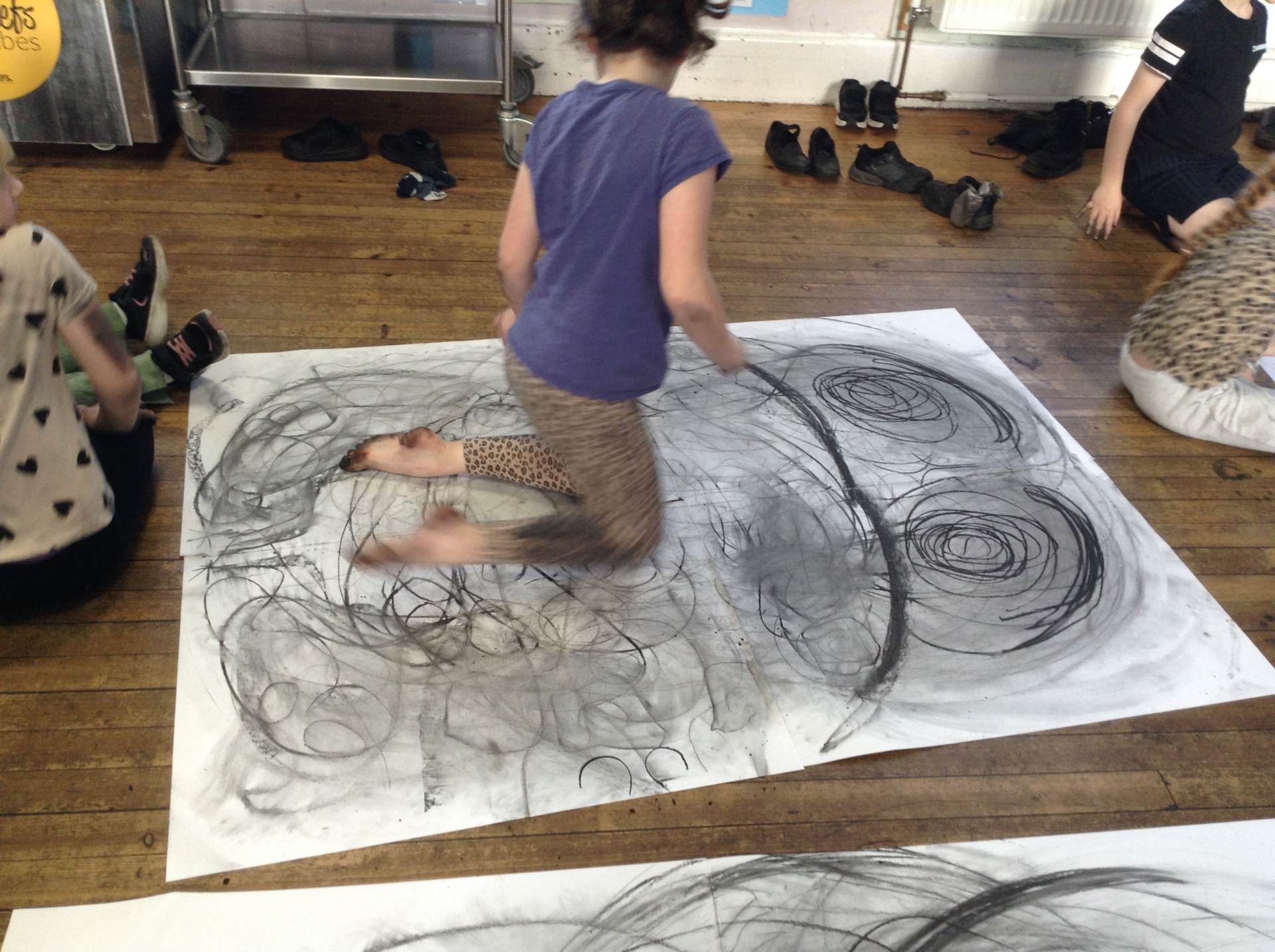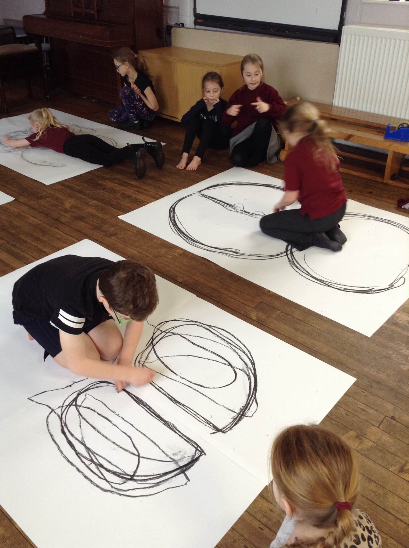 Inspired by the work of Heather Hanson, Owls explored how they could use charcoal and gestural movements made by the body to produce dance-based performance art. Working in groups, they made expressive marks with charcoal. They moved their arms, legs and body whilst moving to the rhythm of the music creating broad sweeping marks on the paper around them. They listened to the music, changing the speed of their movements and the nature of their mark-making. The children took turns and worked on each other’s drawings. Owls really enjoyed the freedom of being expressive, immersing themselves in their artwork and relishing in the liberating medium of charcoal.