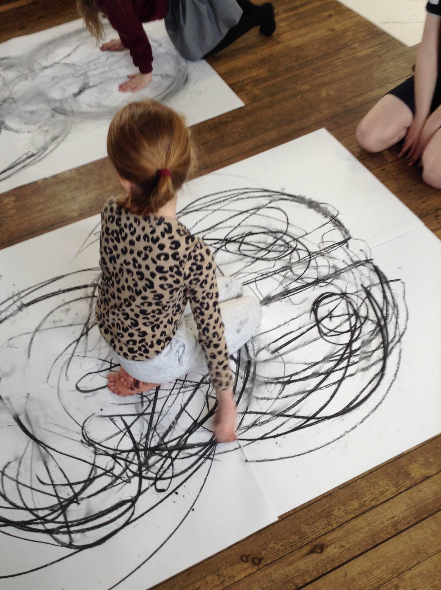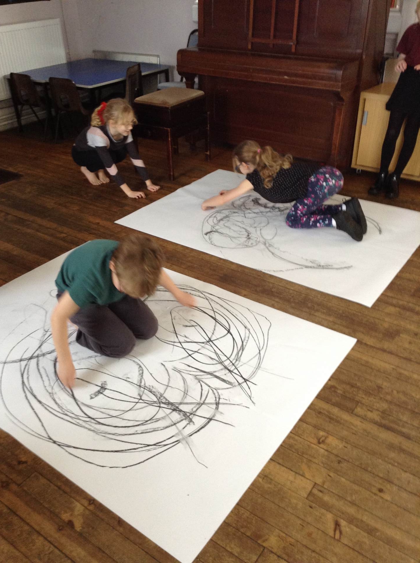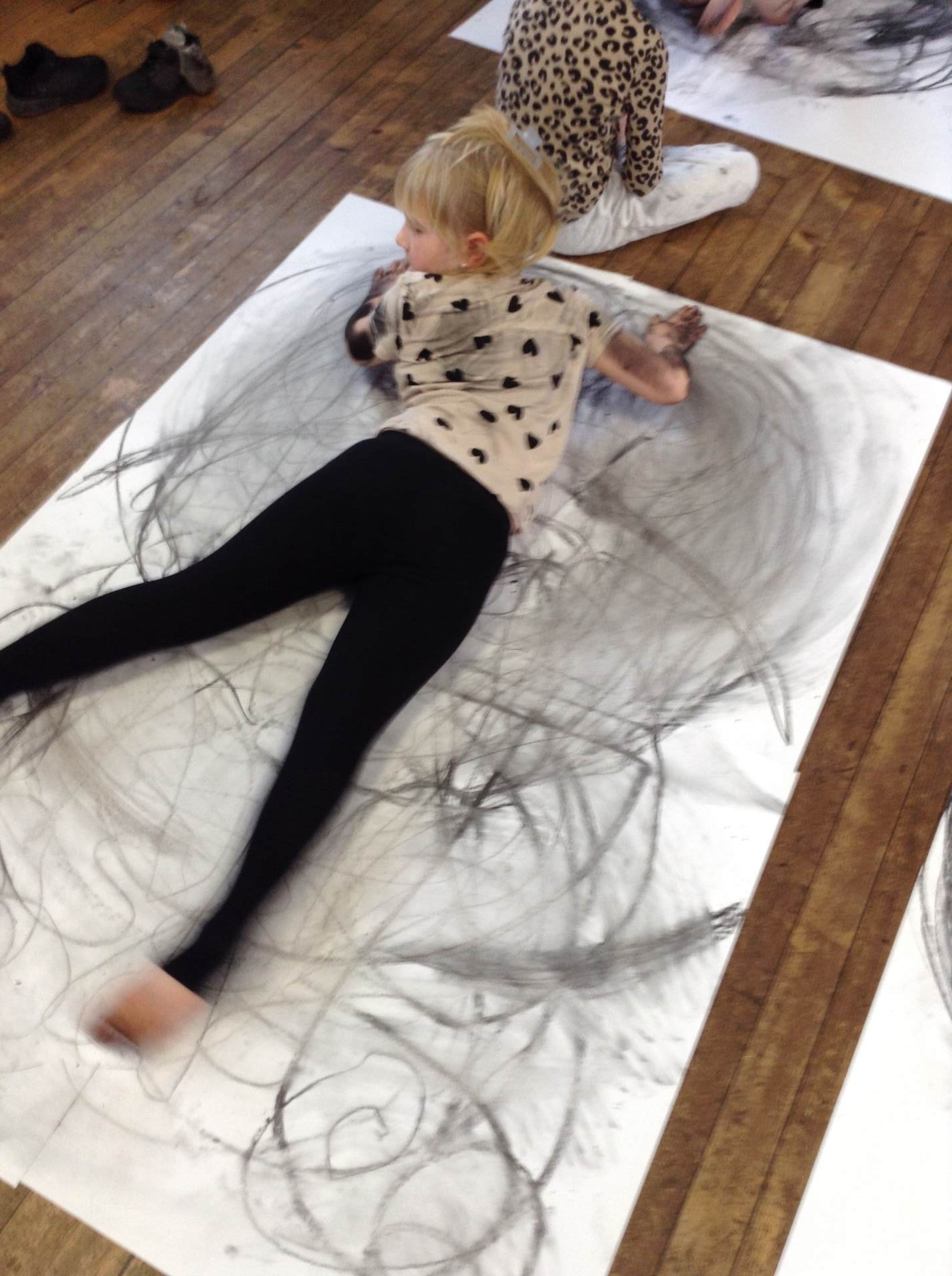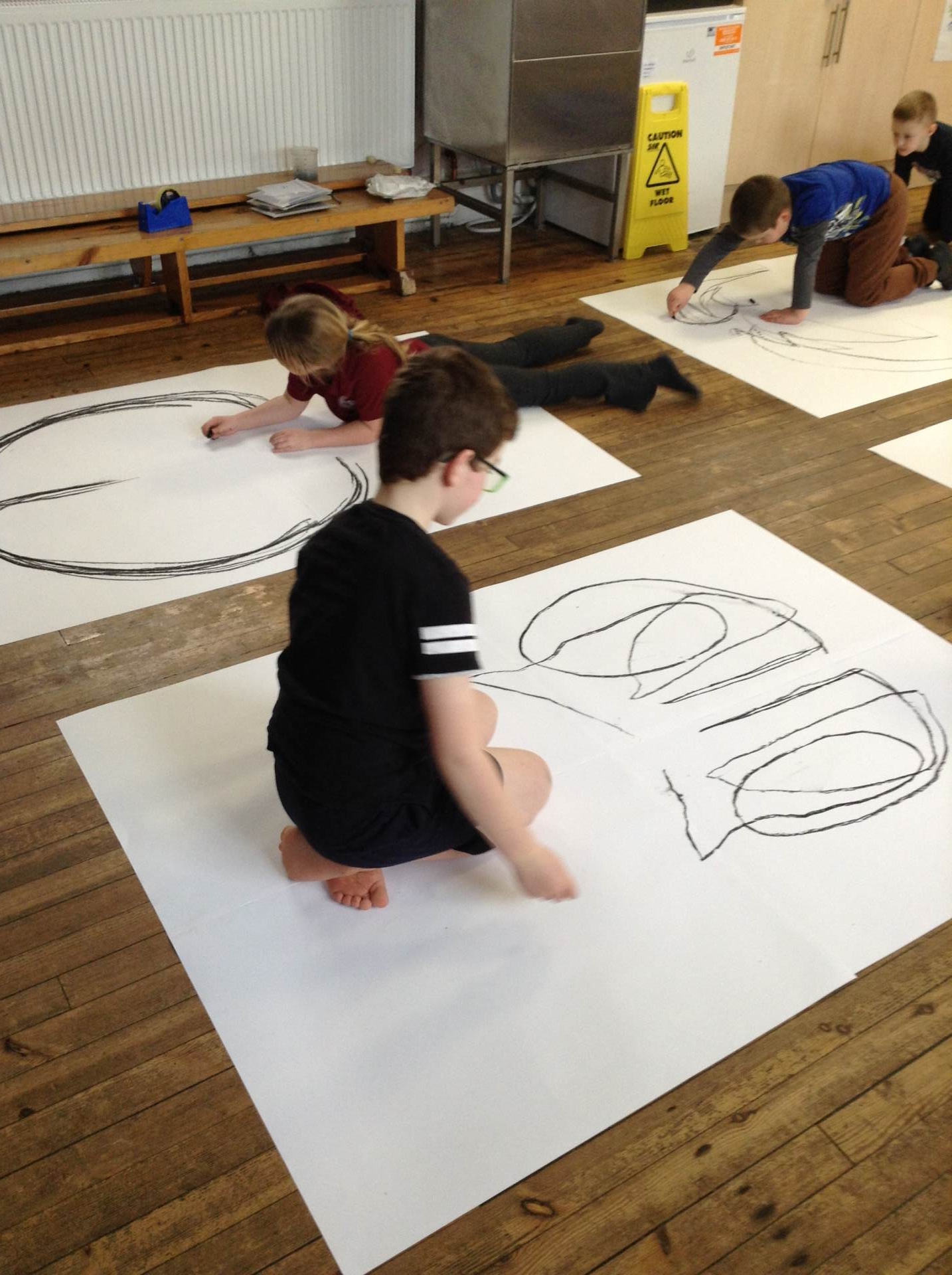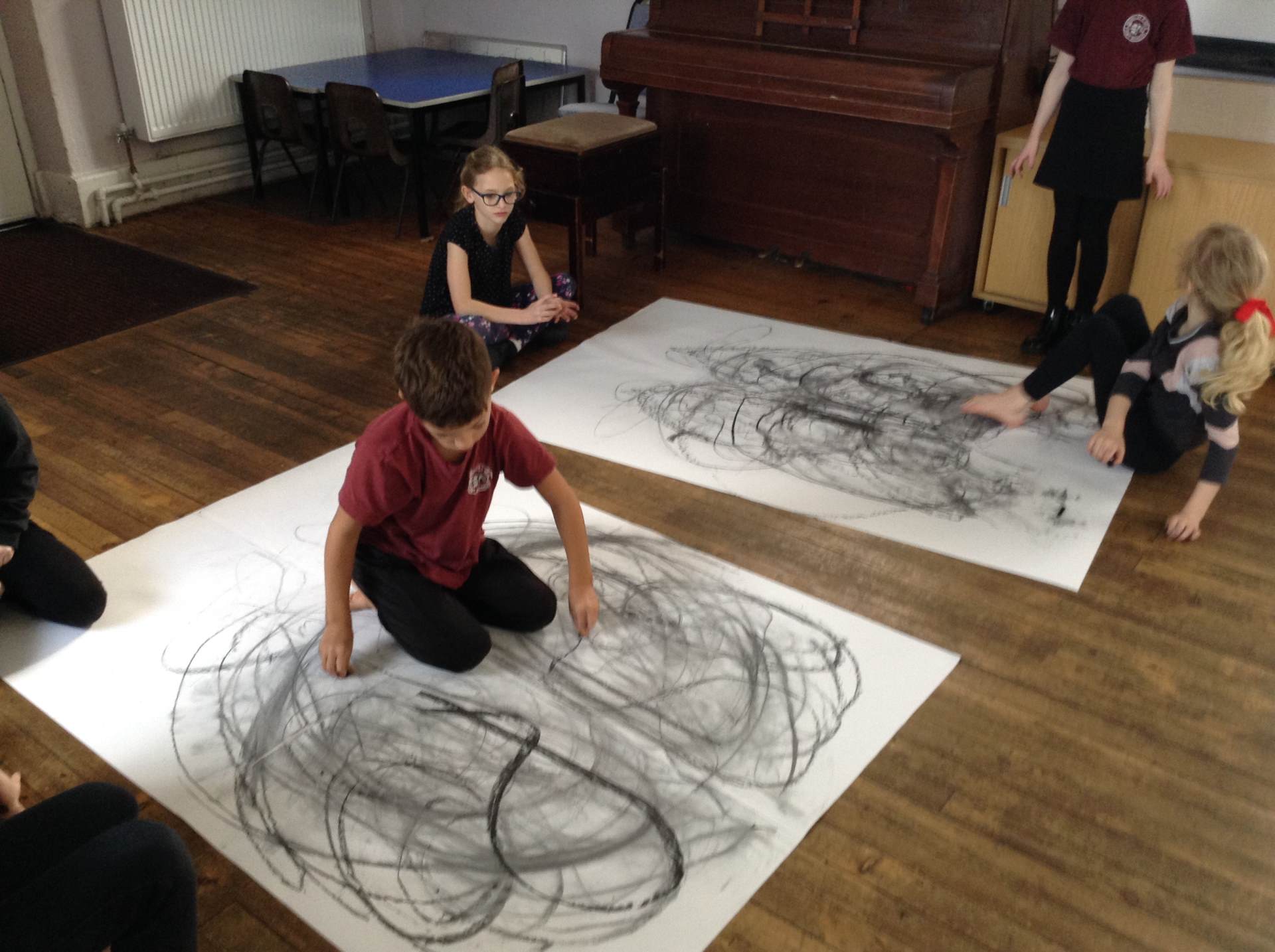 Inspired by the work of Heather Hanson, Owls explored how they could use charcoal and gestural movements made by the body to produce dance-based performance art. Working in groups, they made expressive marks with charcoal. They moved their arms, legs and body whilst moving to the rhythm of the music creating broad sweeping marks on the paper around them. They listened to the music, changing the speed of their movements and the nature of their mark-making. The children took turns and worked on each other’s drawings. Owls really enjoyed the freedom of being expressive, immersing themselves in their artwork and relishing in the liberating medium of charcoal.