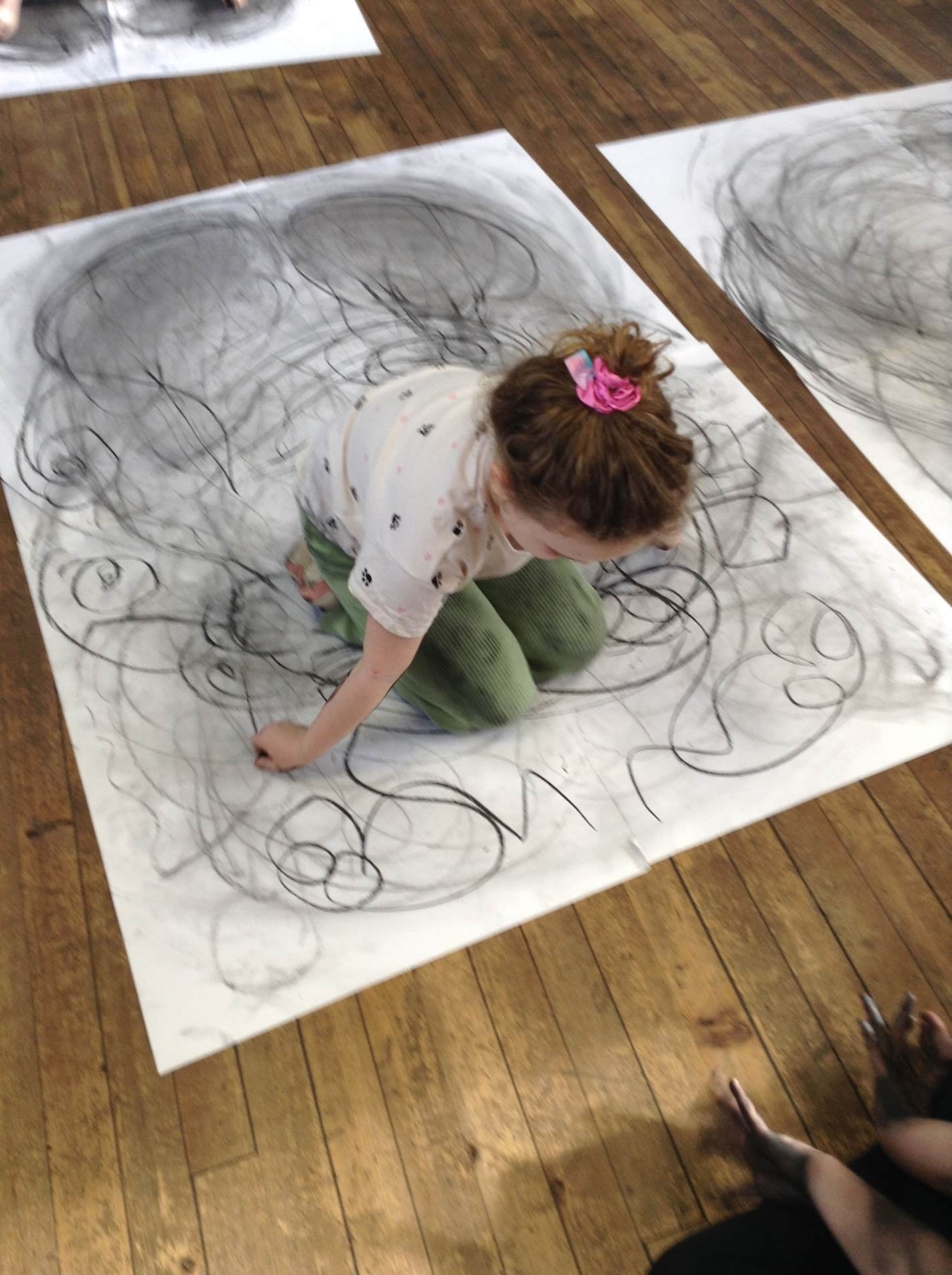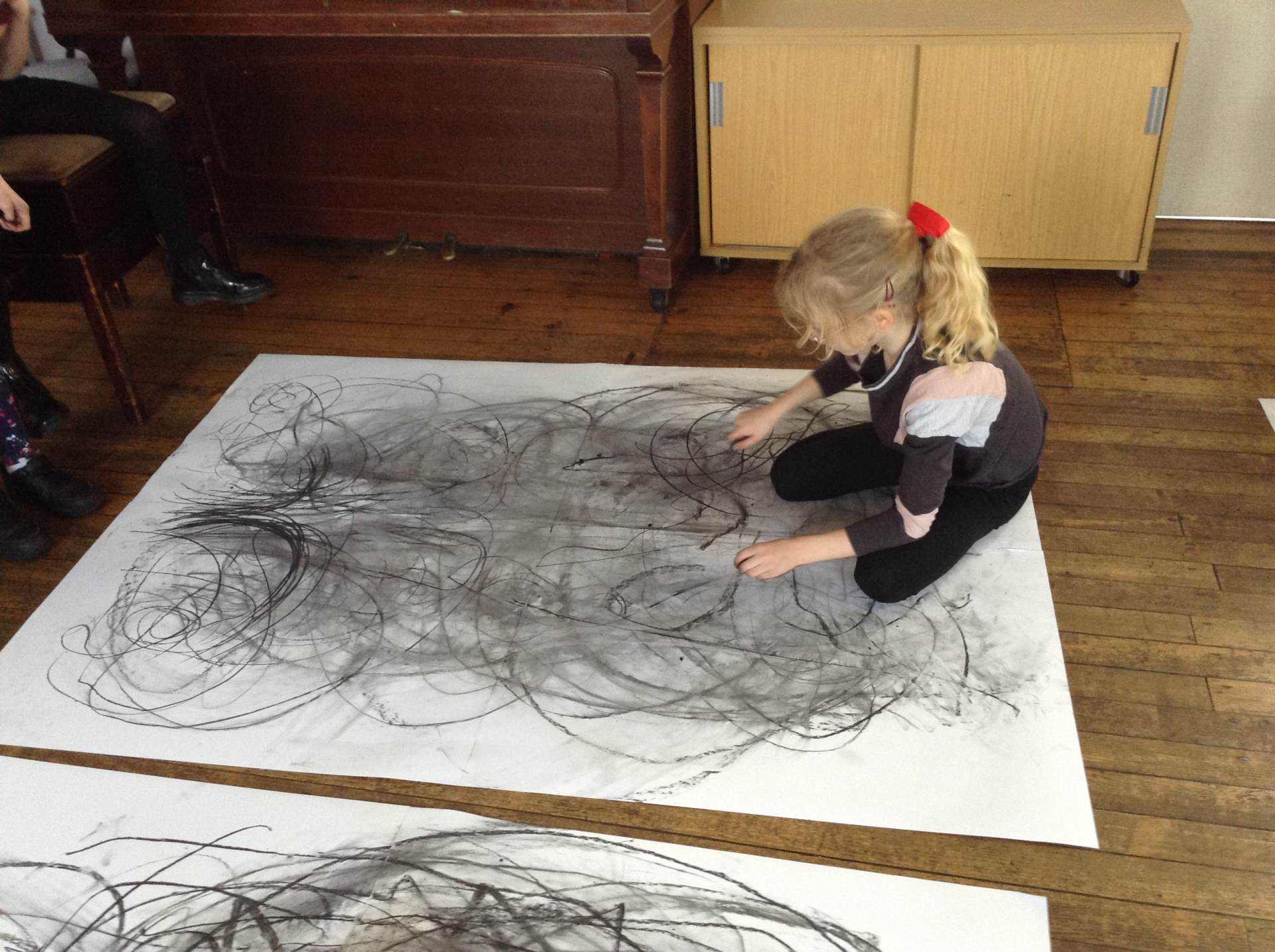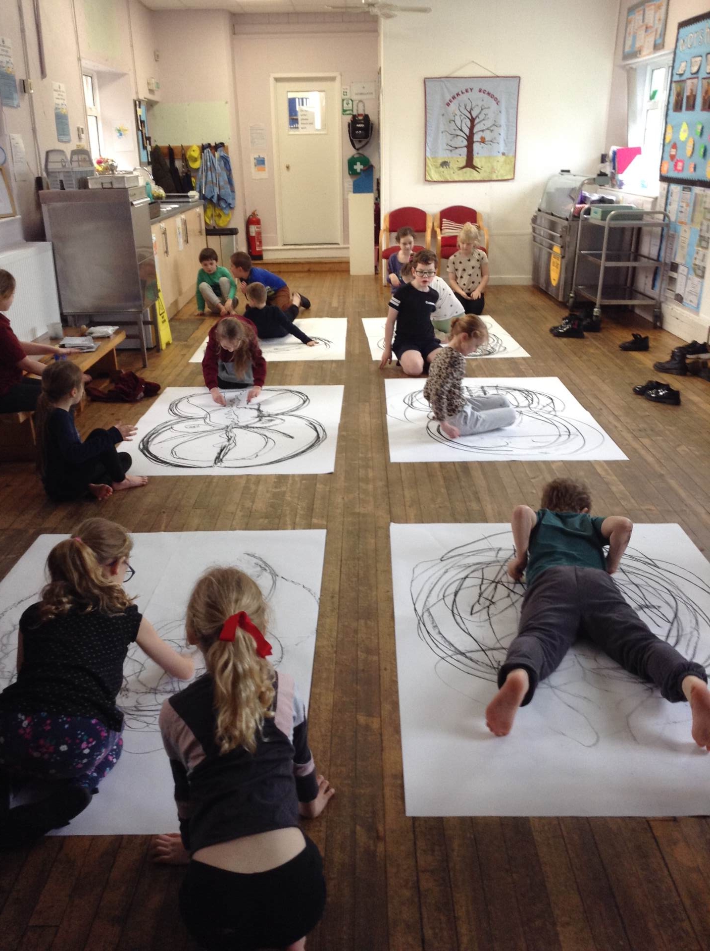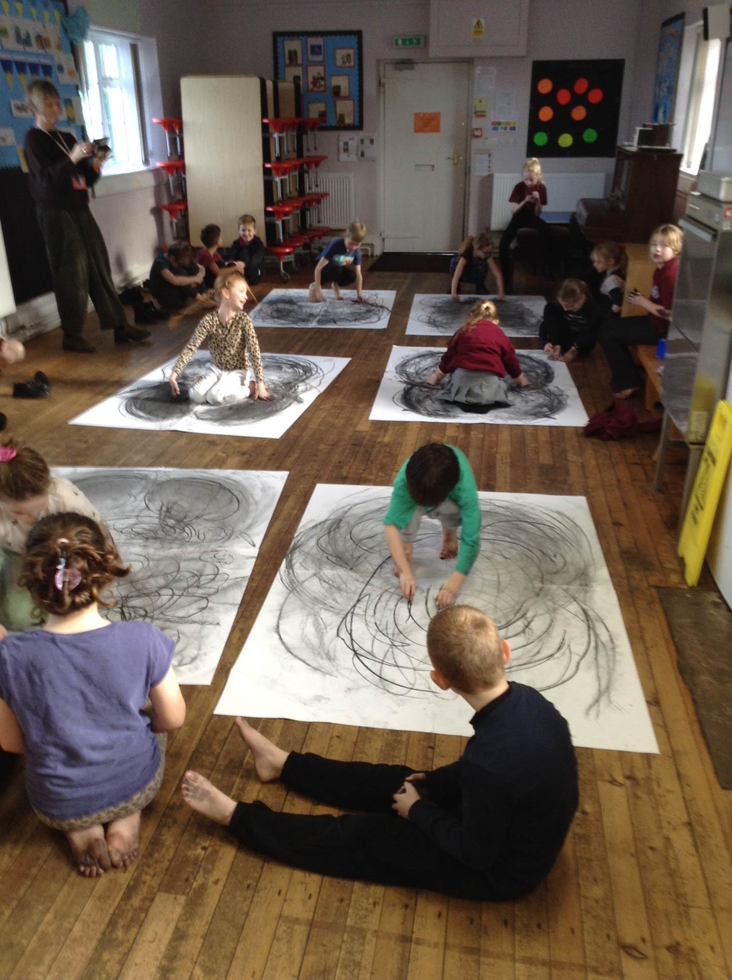 Inspired by the work of Heather Hanson, Owls explored how they could use charcoal and gestural movements made by the body to produce dance-based performance art. Working in groups, they made expressive marks with charcoal. They moved their arms, legs and body whilst moving to the rhythm of the music creating broad sweeping marks on the paper around them. They listened to the music, changing the speed of their movements and the nature of their mark-making. The children took turns and worked on each other’s drawings. Owls really enjoyed the freedom of being expressive, immersing themselves in their artwork and relishing in the liberating medium of charcoal.