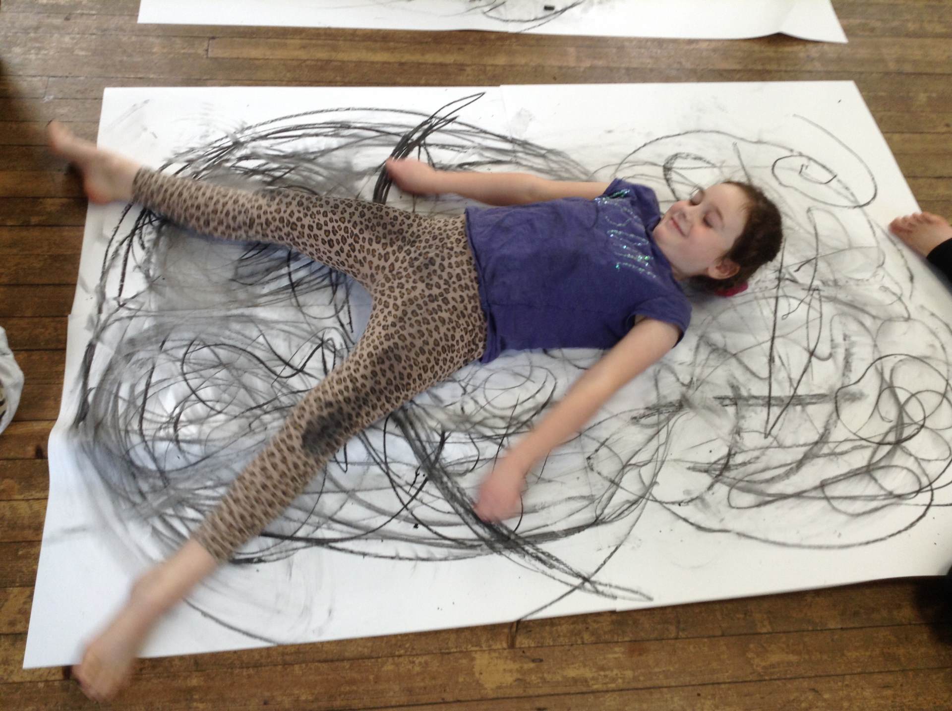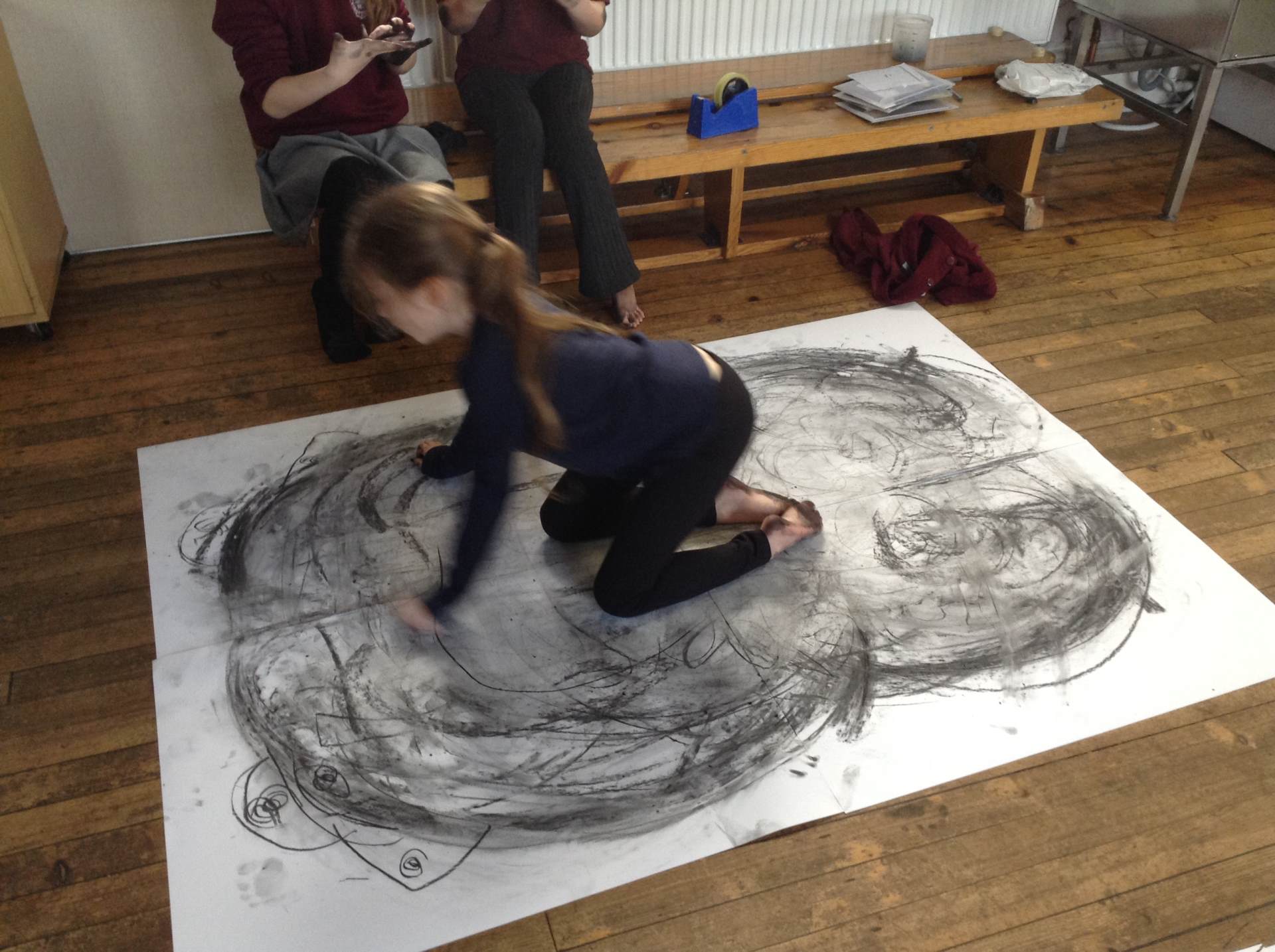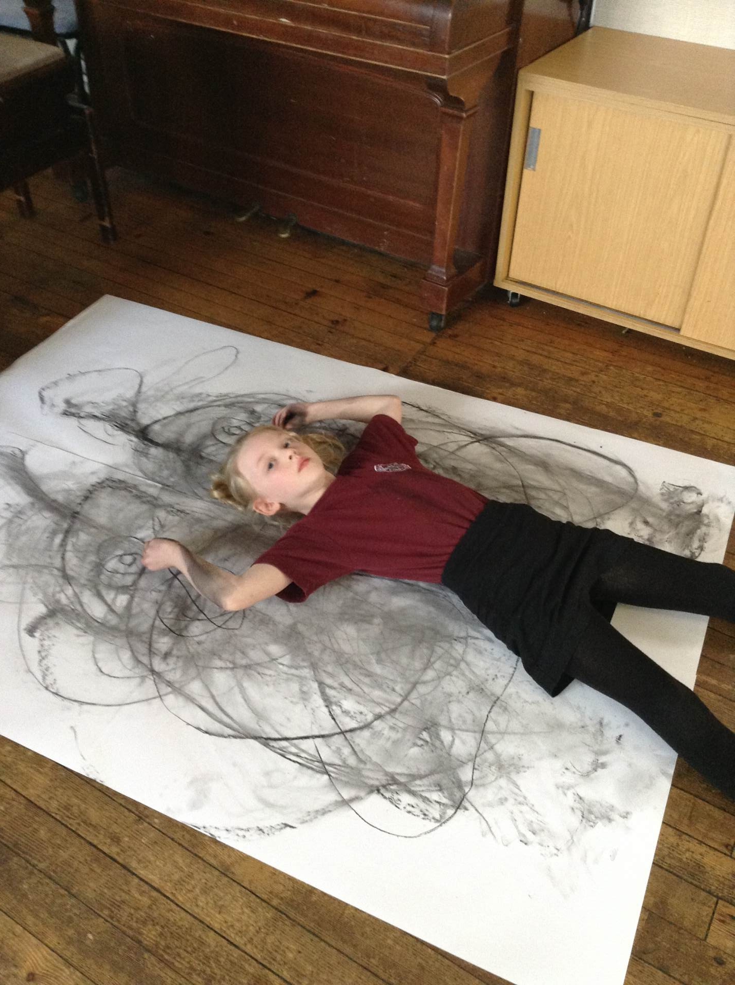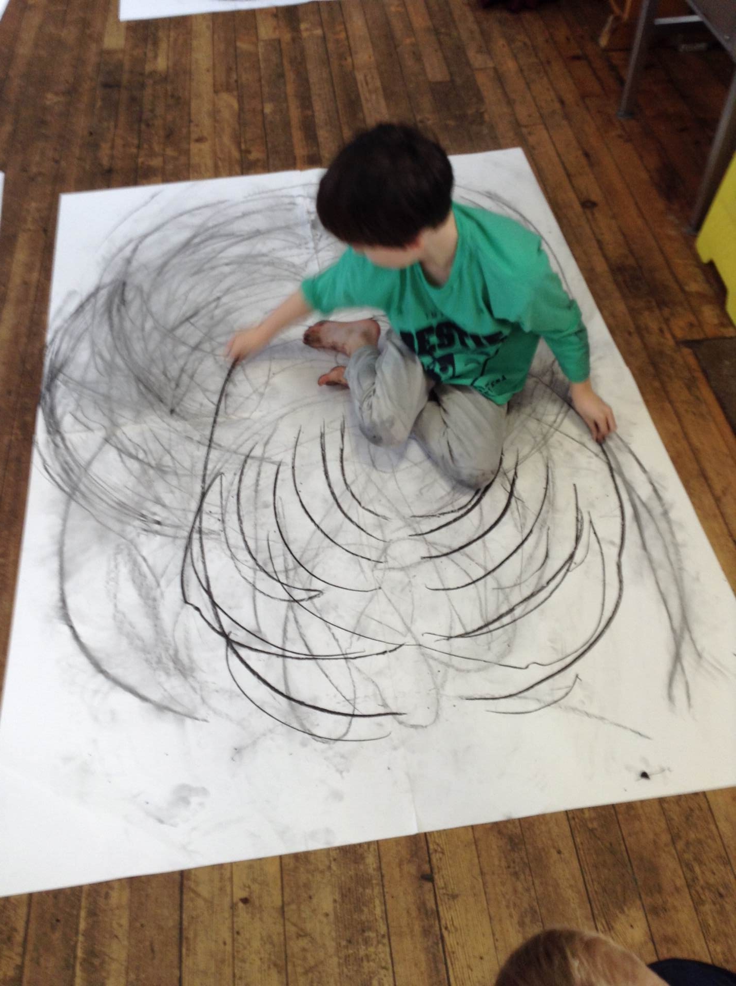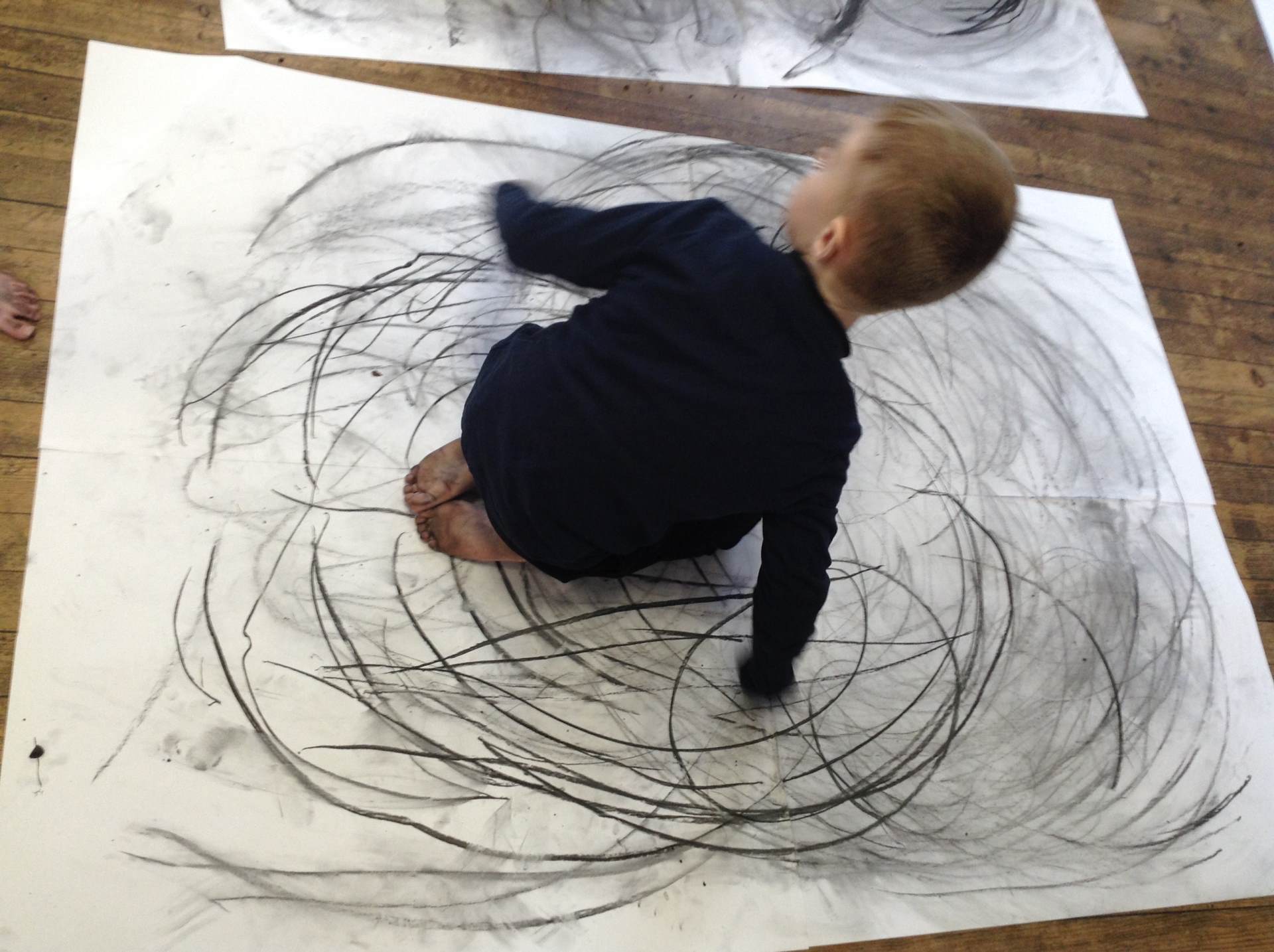 Inspired by the work of Heather Hanson, Owls explored how they could use charcoal and gestural movements made by the body to produce dance-based performance art. Working in groups, they made expressive marks with charcoal. They moved their arms, legs and body whilst moving to the rhythm of the music creating broad sweeping marks on the paper around them. They listened to the music, changing the speed of their movements and the nature of their mark-making. The children took turns and worked on each other’s drawings. Owls really enjoyed the freedom of being expressive, immersing themselves in their artwork and relishing in the liberating medium of charcoal.