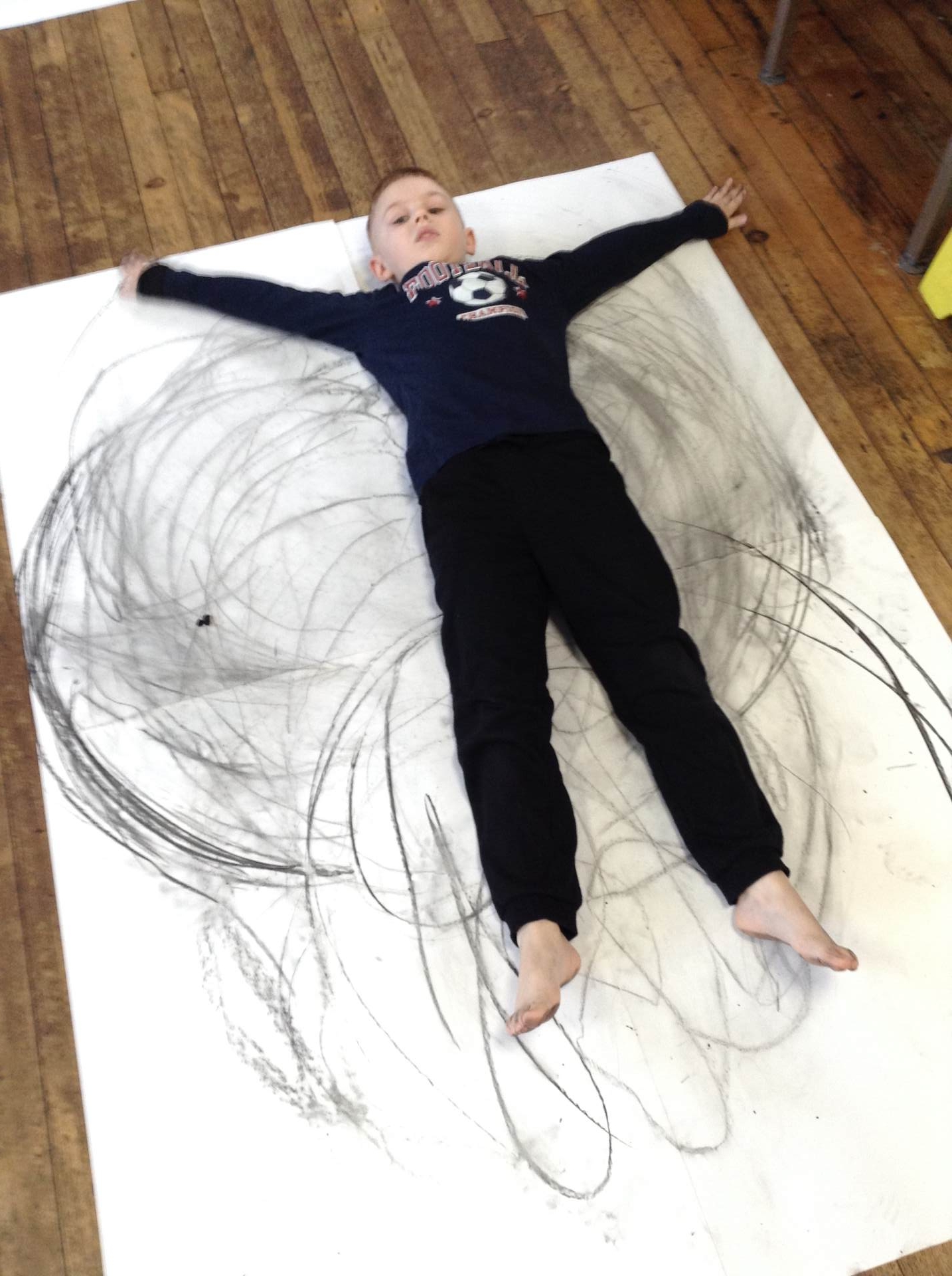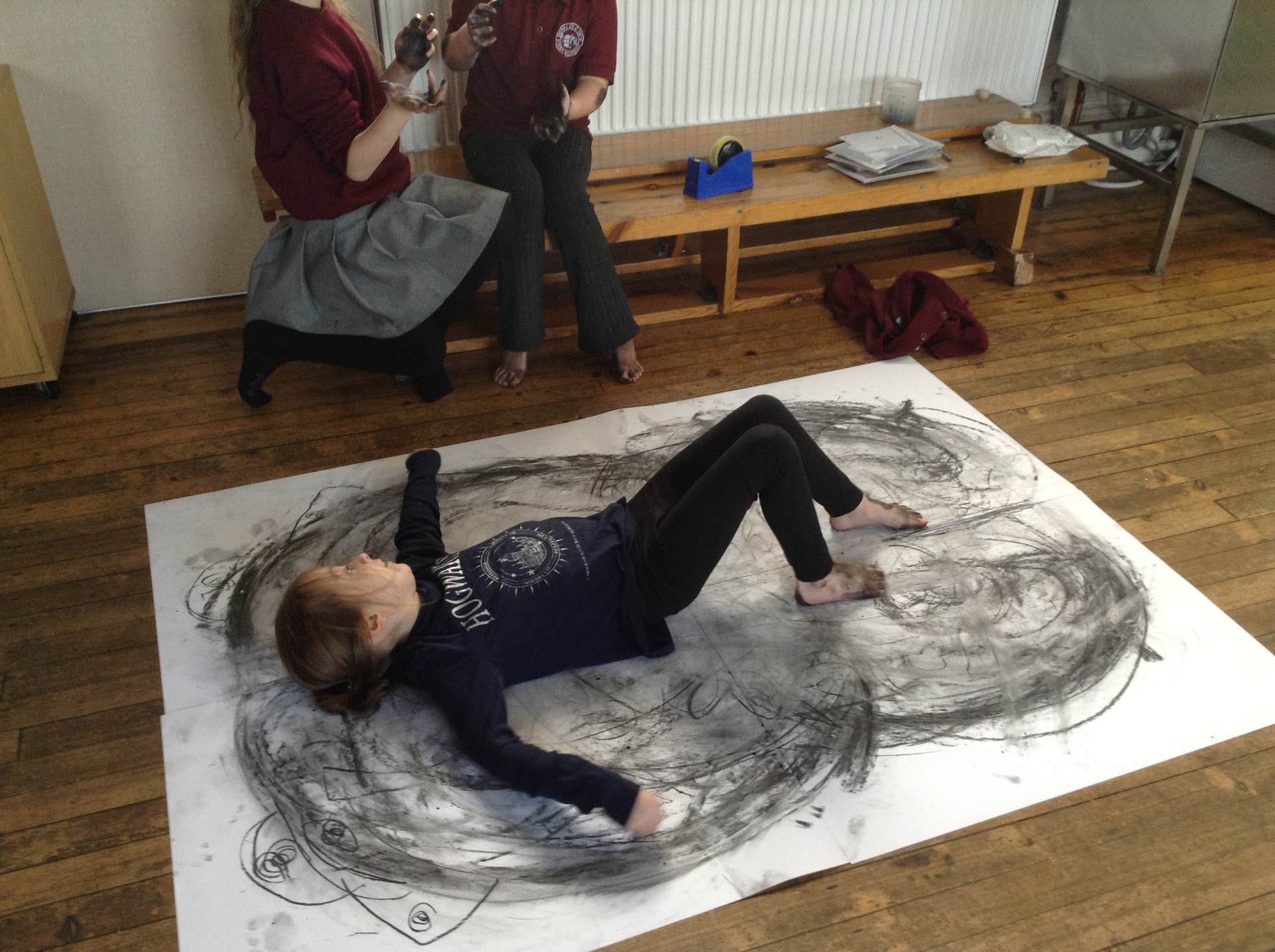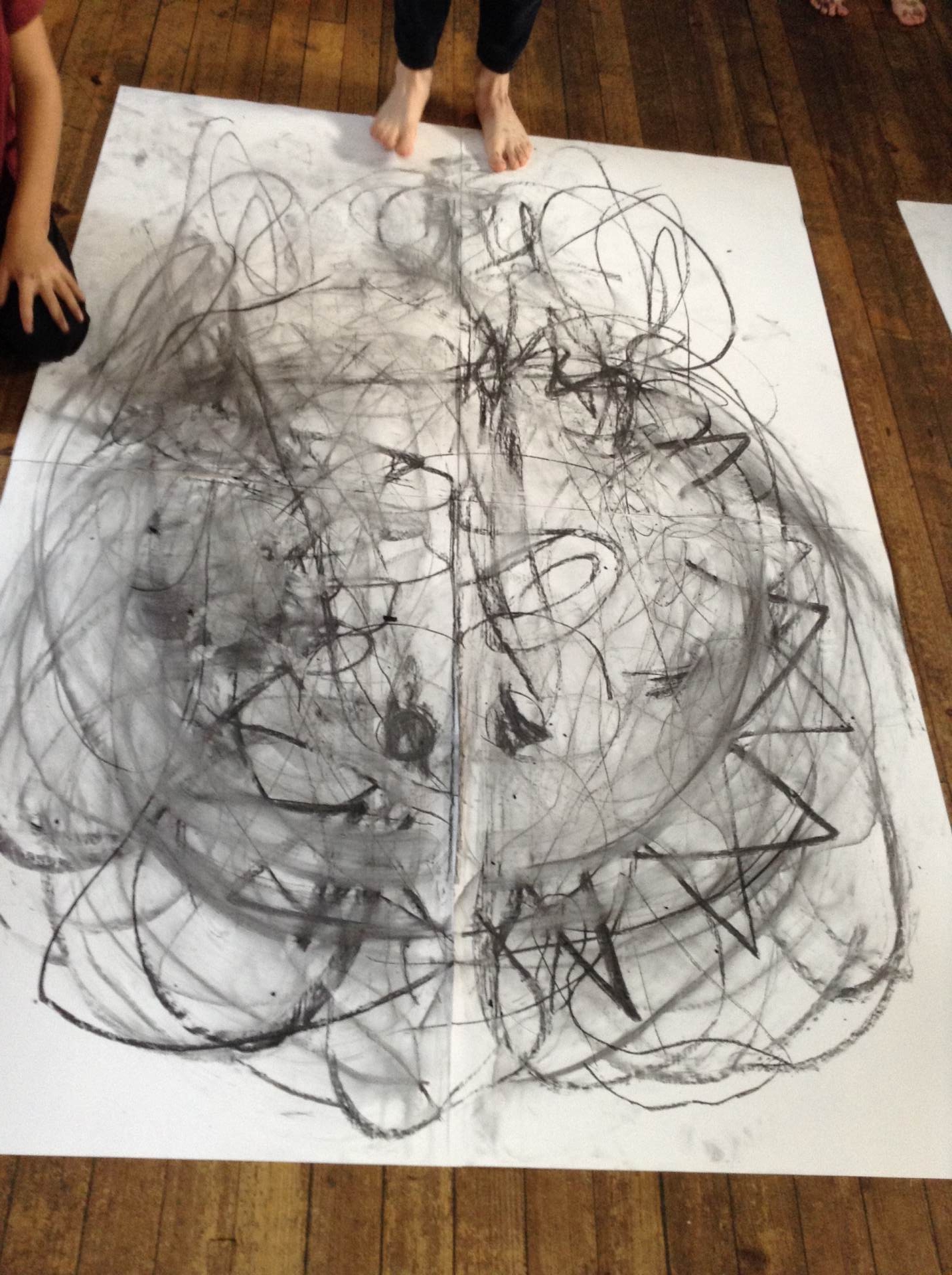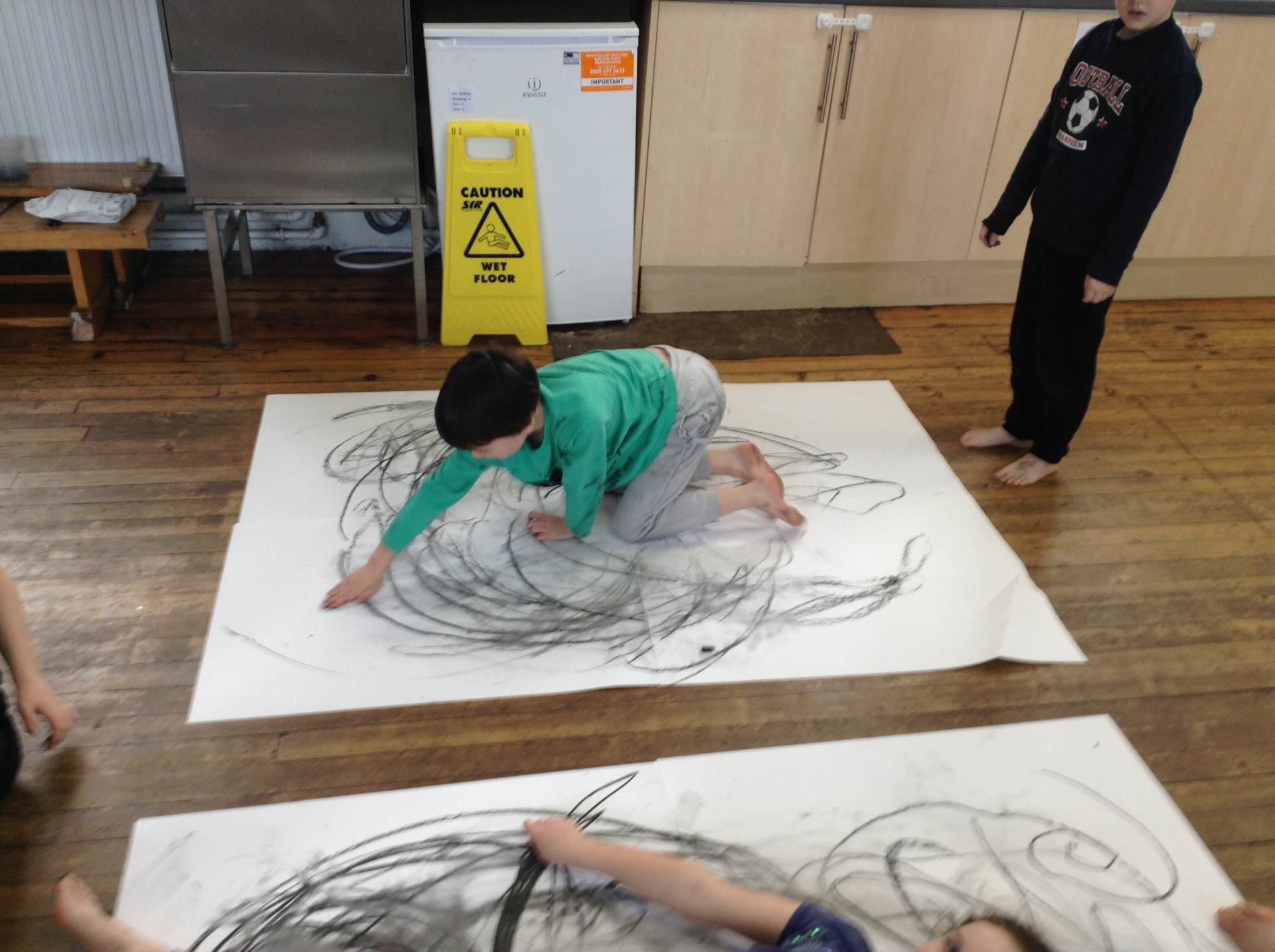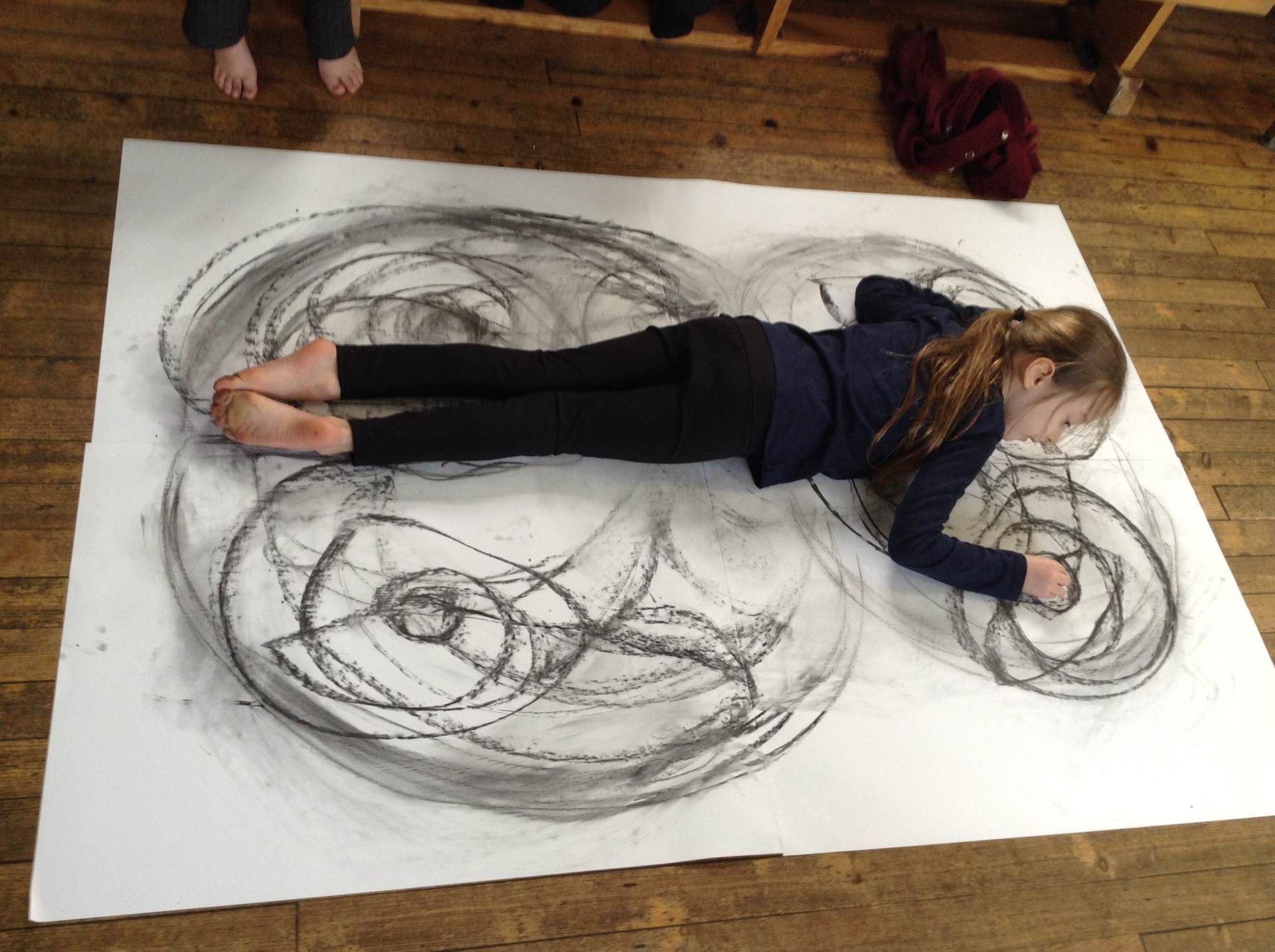 Inspired by the work of Heather Hanson, Owls explored how they could use charcoal and gestural movements made by the body to produce dance-based performance art. Working in groups, they made expressive marks with charcoal. They moved their arms, legs and body whilst moving to the rhythm of the music creating broad sweeping marks on the paper around them. They listened to the music, changing the speed of their movements and the nature of their mark-making. The children took turns and worked on each other’s drawings. Owls really enjoyed the freedom of being expressive, immersing themselves in their artwork and relishing in the liberating medium of charcoal.