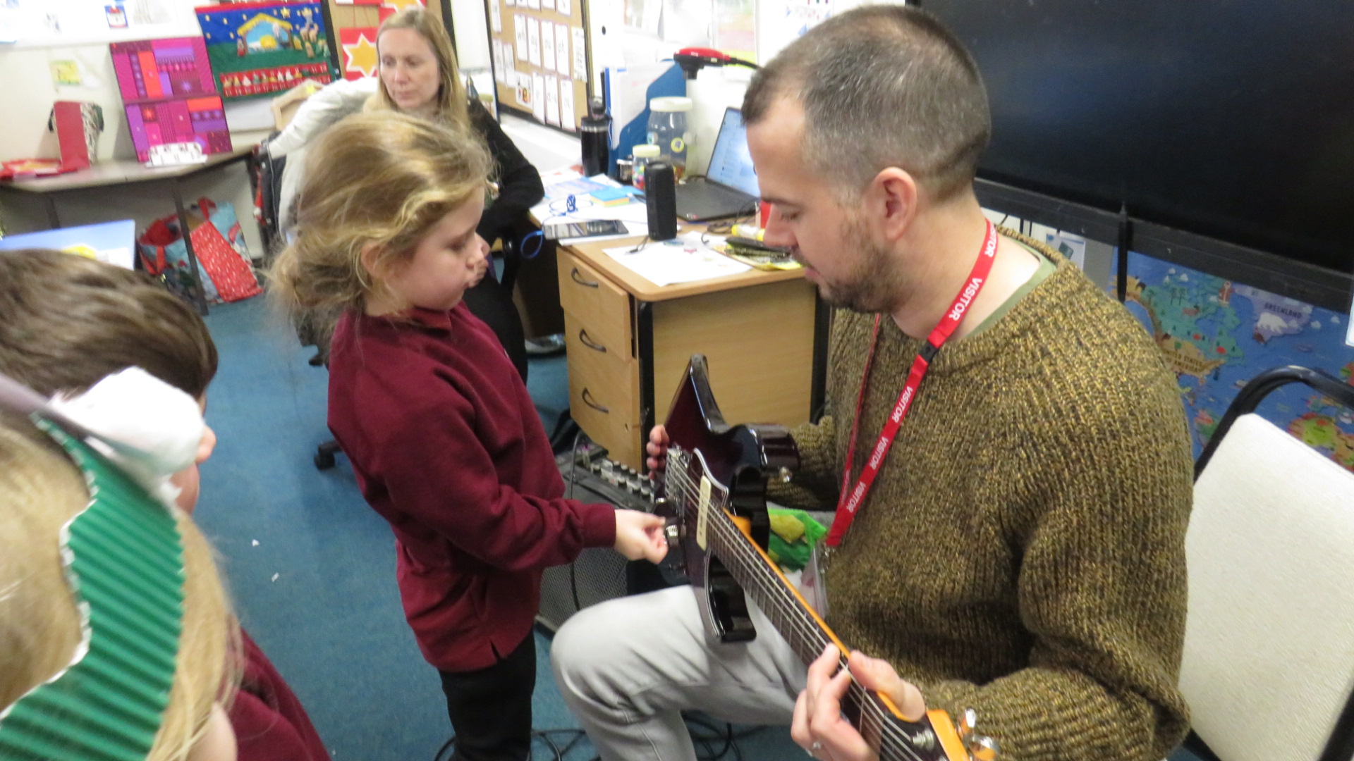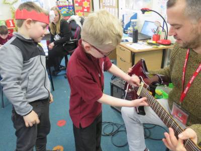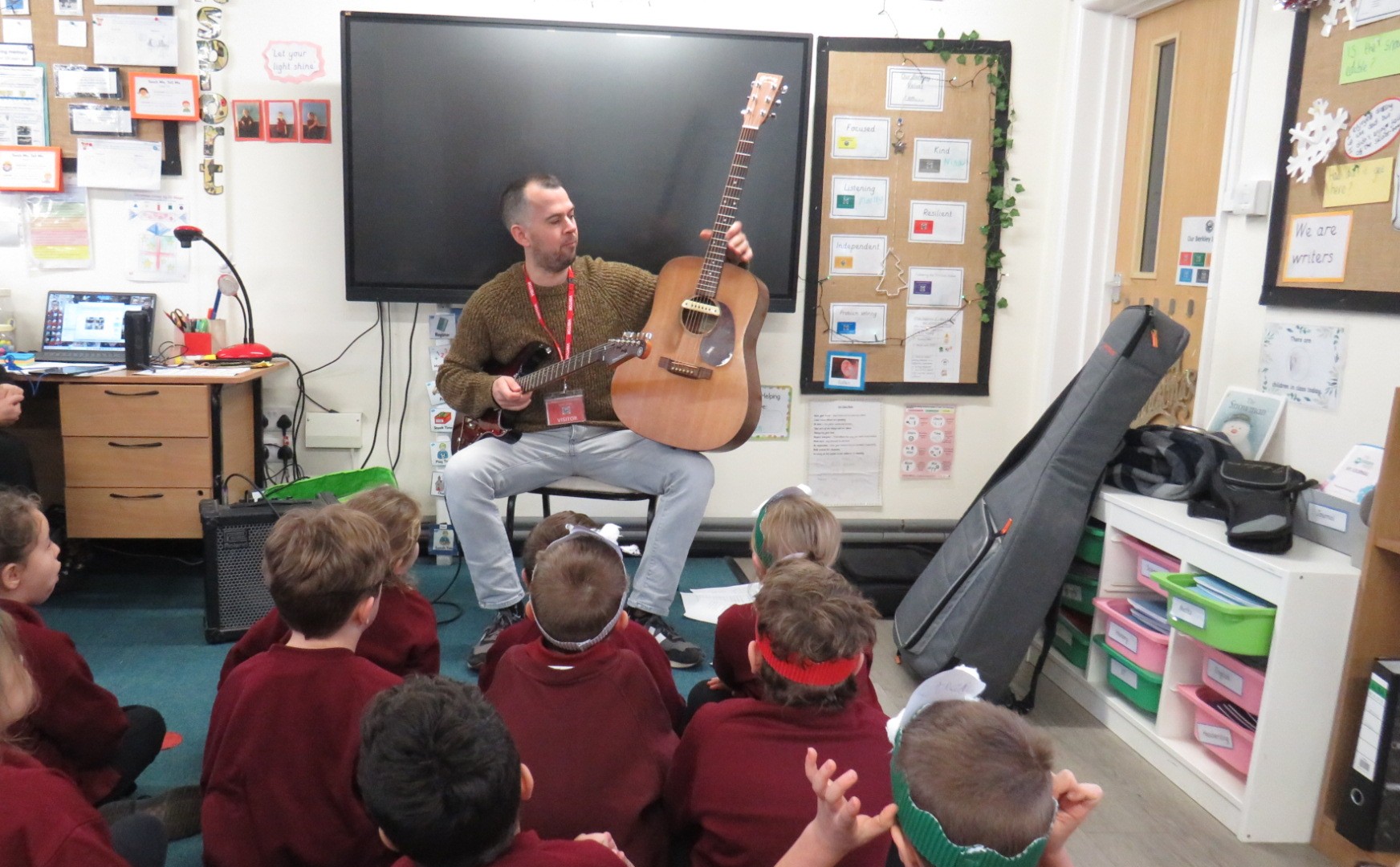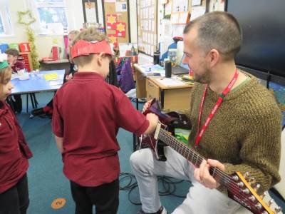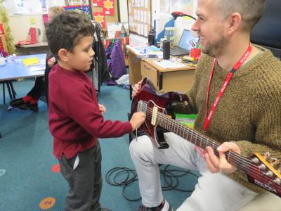 We were thrilled to welcome Mr Veale, a parent from Badgers Class to our classroom recently. He brought his guitars and shared his musical talents with the children, giving them an enjoyable and interactive experience. The children were excited to listen and learn about different sounds and rhythms.