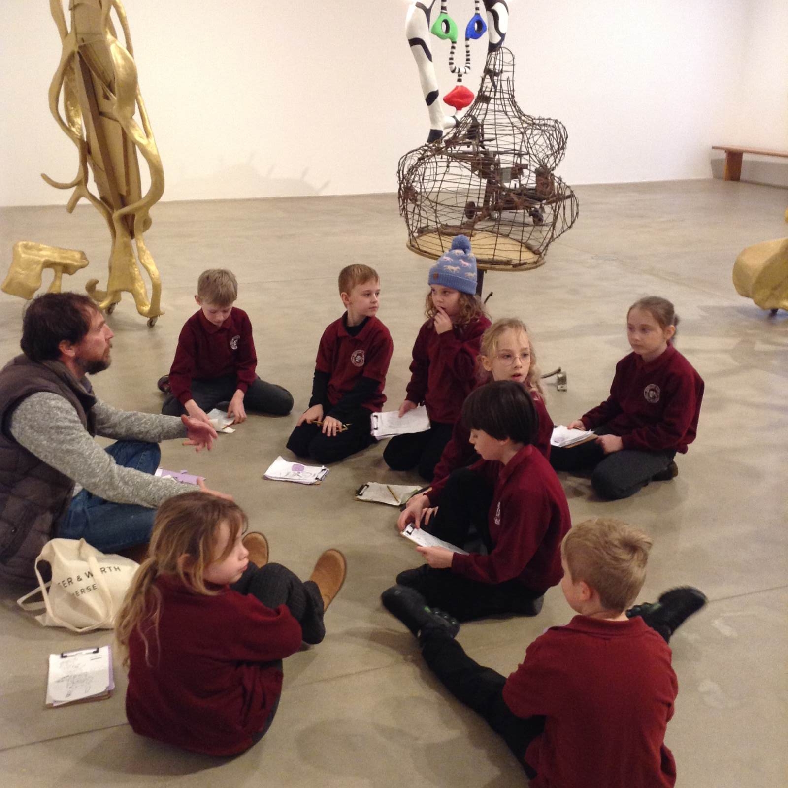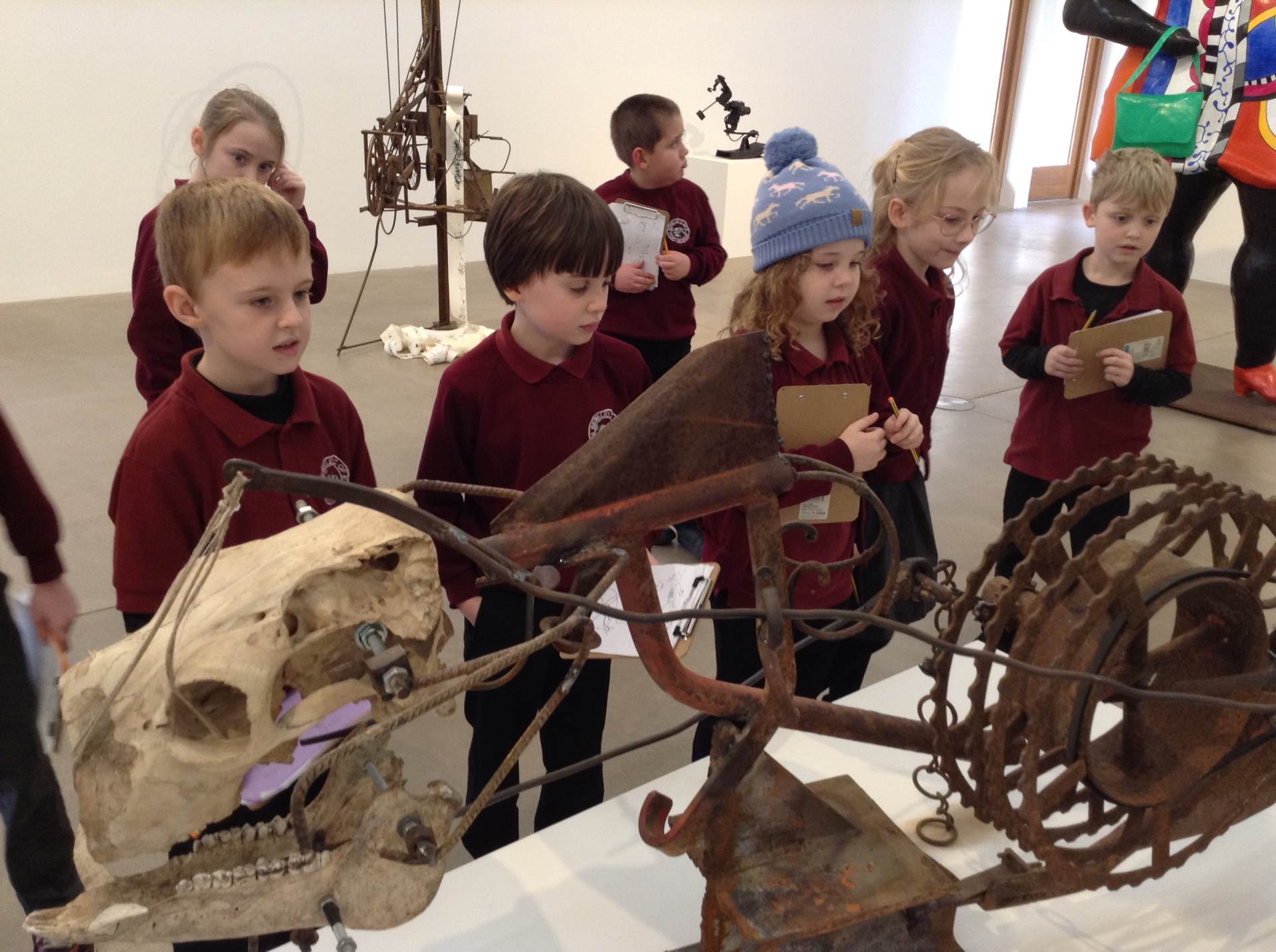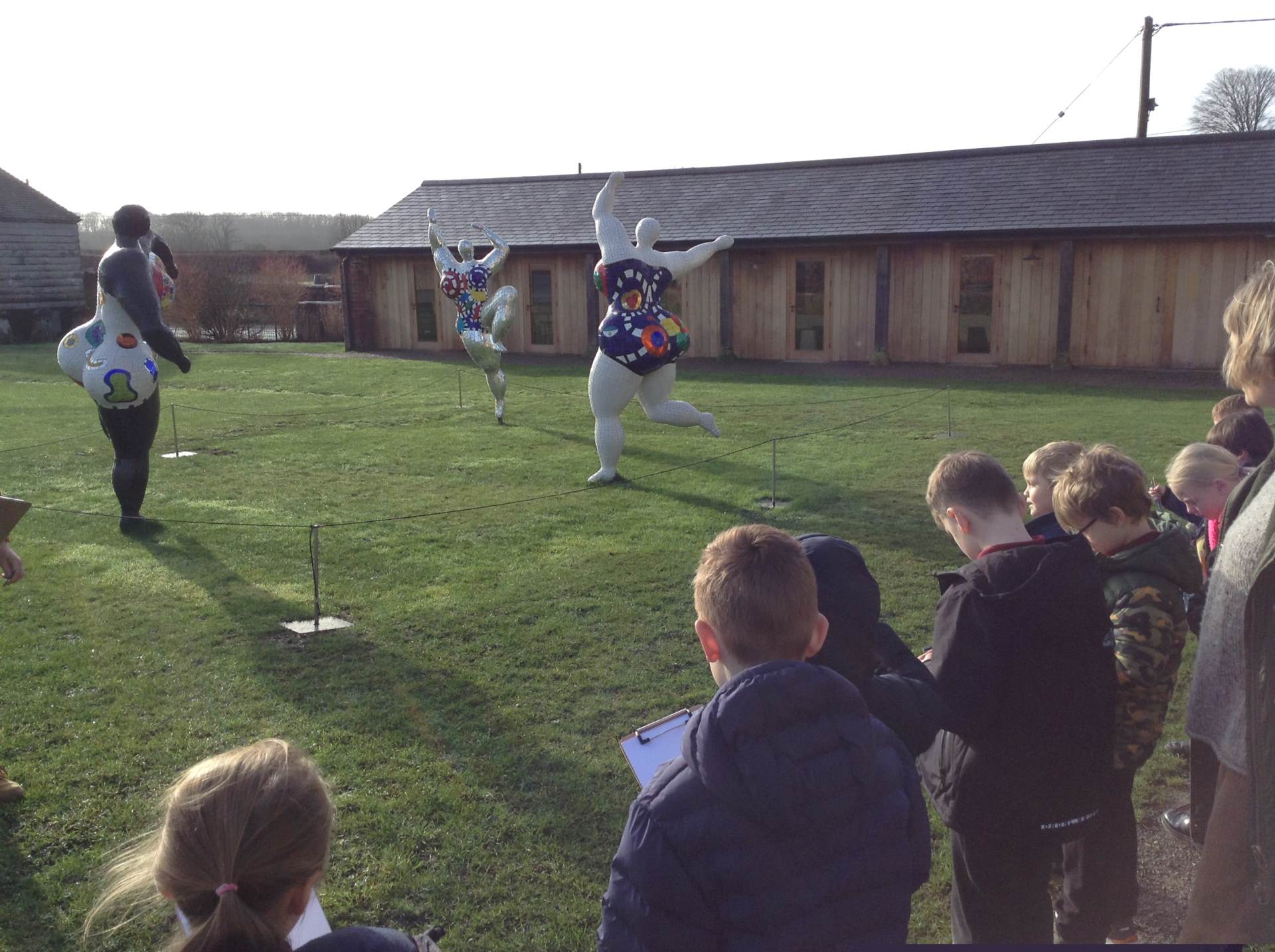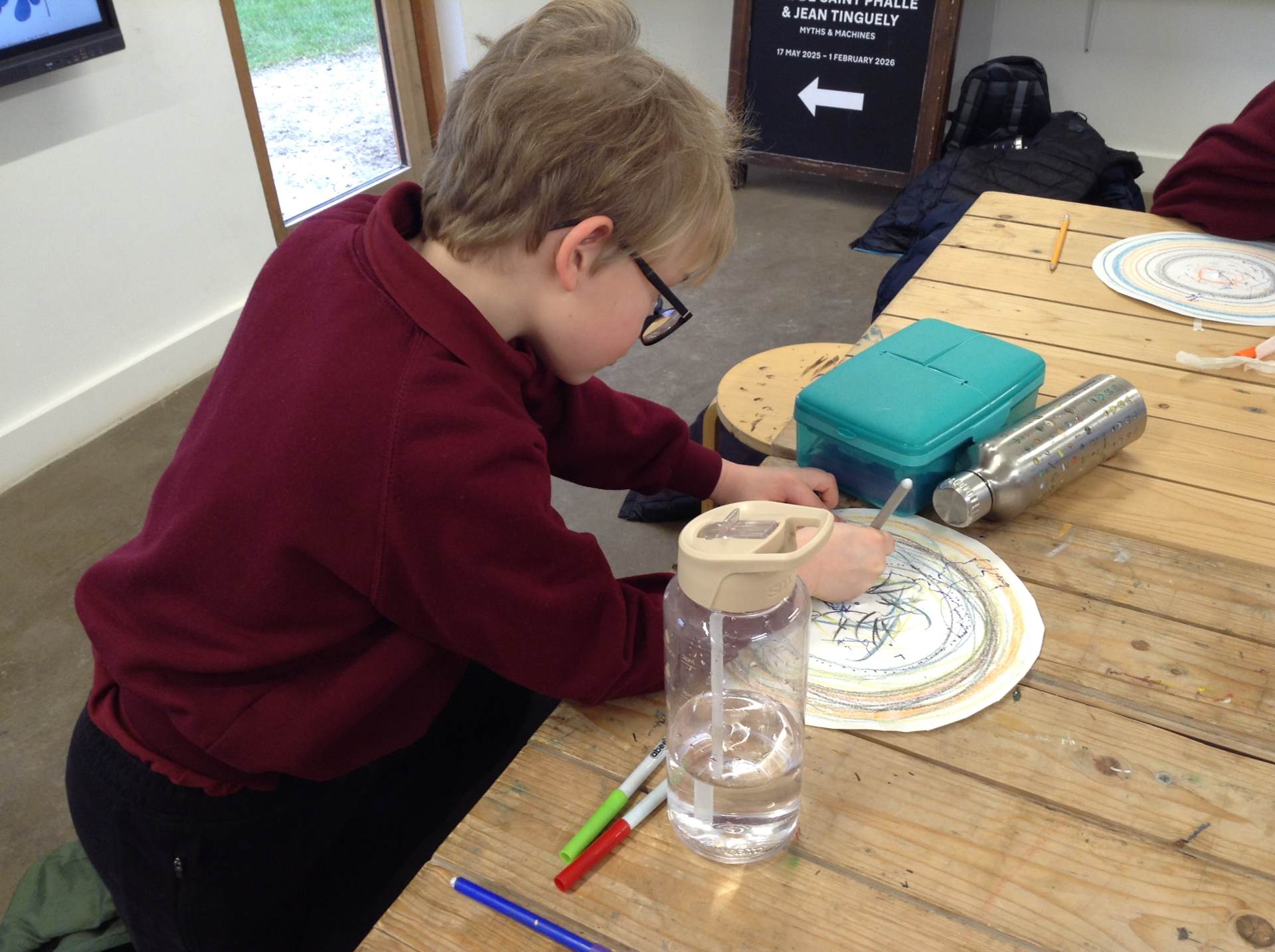 Owls had an amazing day visiting Hauser and Wirth Art Gallery! Our adventure began by travelling to Bruton by train and then walking to the gallery. Eventually we arrived and looked at the work of two artists, Niki de Phalle and Jean Tinguely.  Niki de Saint Phalle and Jean Tinguely were pioneering artists who worked in collaboration with each other. Tinguely became known for his moving sculptures, termed ‘Métamatics,’ which were mechanical constructions. Niki de Saint Phalle gained widespread recognition for her ‘Nanas’ which were large-scale, brightly colored sculptures of female figures that celebrate femininity. The children looked at the artwork and created line drawings of both the ‘Nanas’ and Tinguely’s mechanical sculptures. The children loved the artwork, especially the glass mosaic skull and the gold bed. Later that afternoon, Owls had fun making spin pictures on a record deck and creating drawings using an electric toothbrush, masking tape and felt-tips! At the end of the day, Owls braved the wet weather, walked back to the station and returned home again by train. It was brilliant!