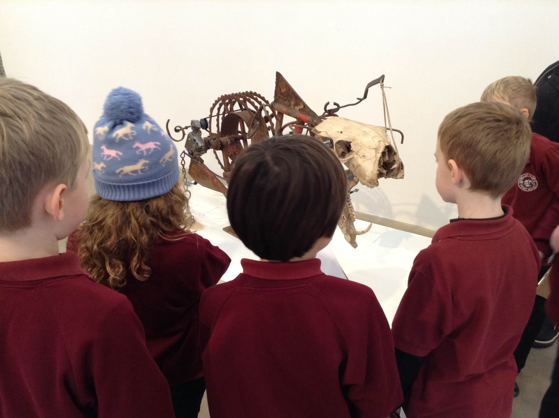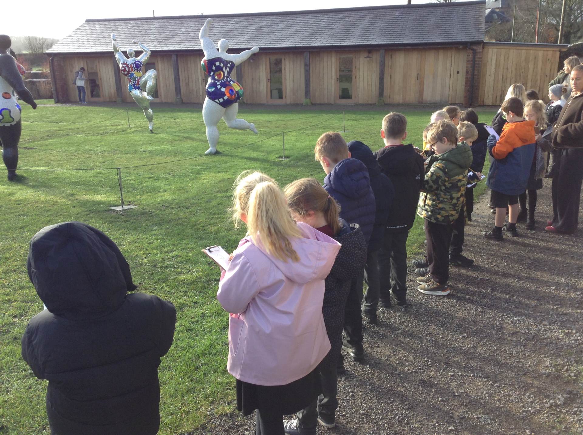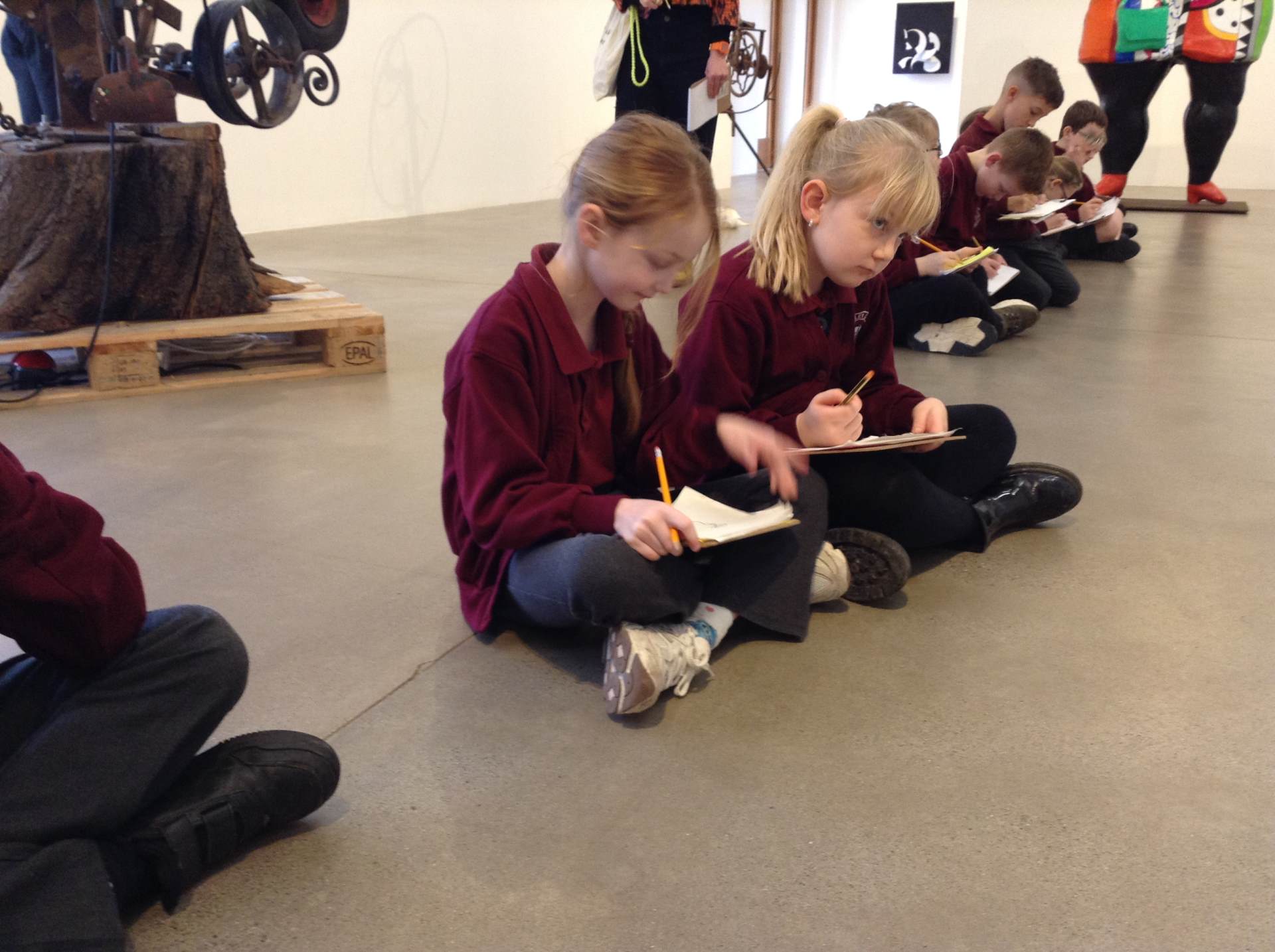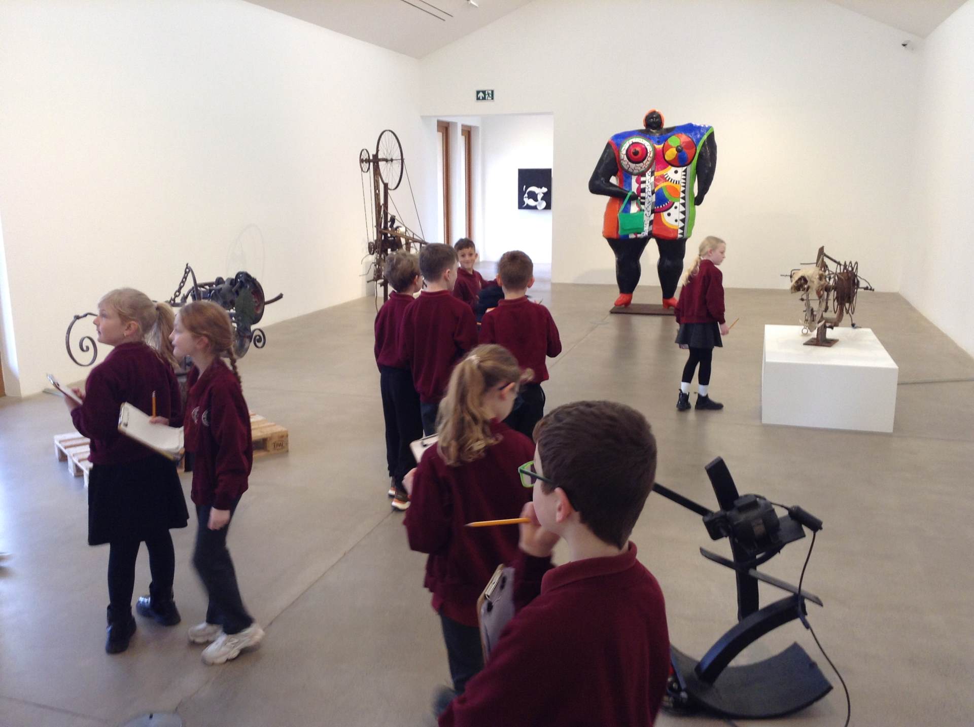 Owls had an amazing day visiting Hauser and Wirth Art Gallery! Our adventure began by travelling to Bruton by train and then walking to the gallery. Eventually we arrived and looked at the work of two artists, Niki de Phalle and Jean Tinguely.  Niki de Saint Phalle and Jean Tinguely were pioneering artists who worked in collaboration with each other. Tinguely became known for his moving sculptures, termed ‘Métamatics,’ which were mechanical constructions. Niki de Saint Phalle gained widespread recognition for her ‘Nanas’ which were large-scale, brightly colored sculptures of female figures that celebrate femininity. The children looked at the artwork and created line drawings of both the ‘Nanas’ and Tinguely’s mechanical sculptures. The children loved the artwork, especially the glass mosaic skull and the gold bed. Later that afternoon, Owls had fun making spin pictures on a record deck and creating drawings using an electric toothbrush, masking tape and felt-tips! At the end of the day, Owls braved the wet weather, walked back to the station and returned home again by train. It was brilliant!